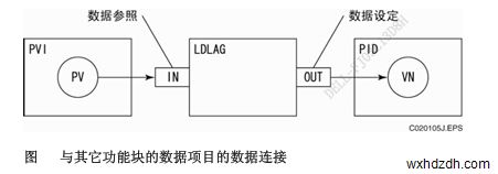所謂與其它功能塊數據連接,是將保存在其它功能塊的測量值(PV)、操作輸出值(MV)等的數據項目連接到功能塊的輸入輸出端子時的輸入輸出連接。與其它功能塊的數據項目連接的示例如下: